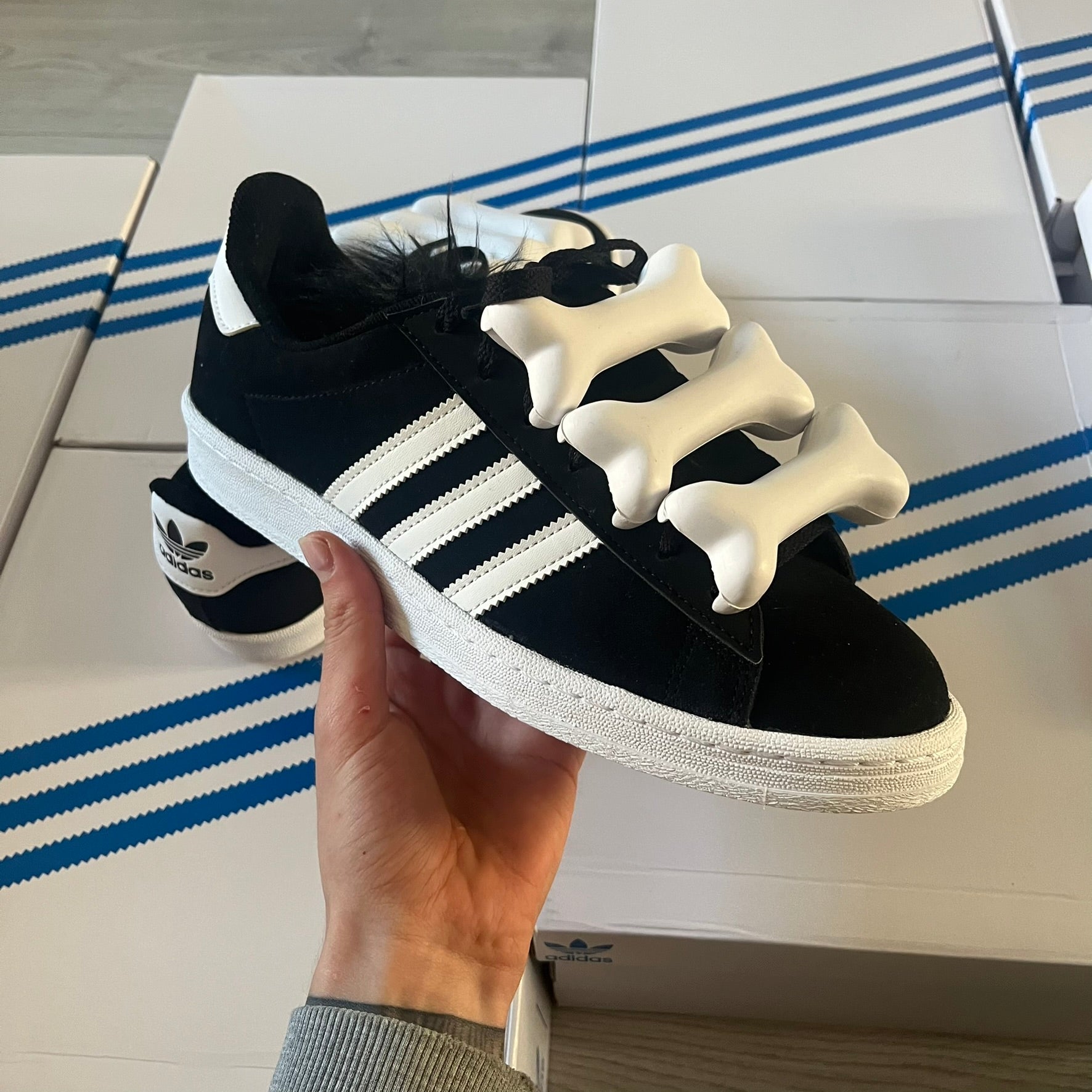 ● jeremy scott’s take on the adidas campus 80s includes black leather, serrated stripes, and unique faux fur tongues. detachable white bones on the laces add a customizable, standout touch. this 2023 release balances classic style with avant-garde details.